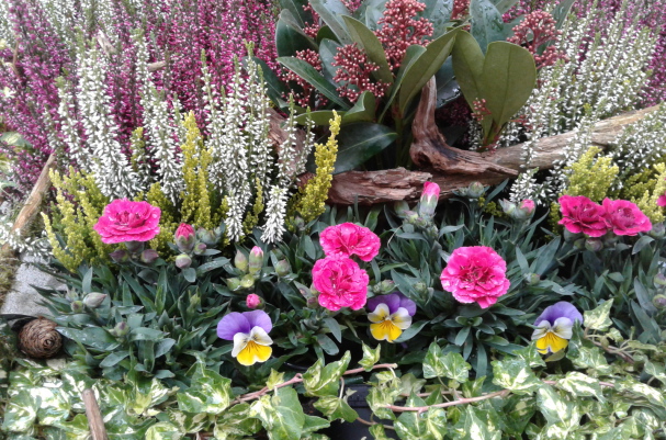 - große Auswahl an winterharten Pflanzen, Heidekraut und Stiefmütterchen